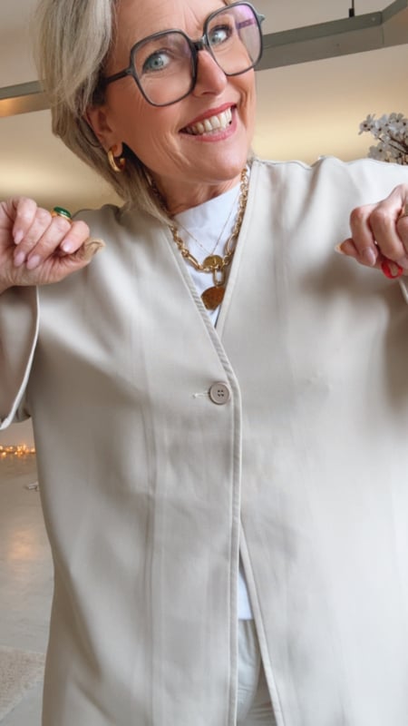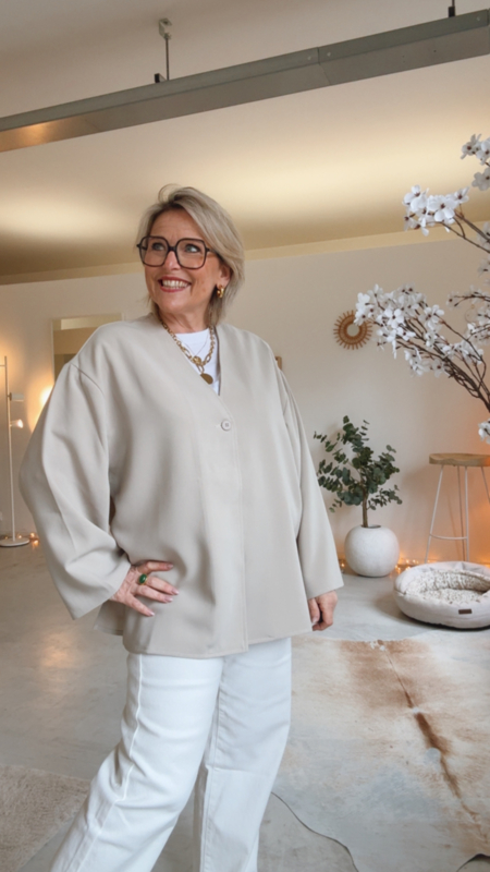 Dit prachtige blaservest is zo’n stuk dat meteen klasse uitstraalt, maar tegelijk heerlijk comfortabel draagt. De zachte beige tint maakt het makkelijk te combineren, zowel casual als iets gekleder. Dankzij de mooie rechte snit en de subtiele knoop vooraan krijgt het vest een elegante, moderne look zonder stijf aan te voelen.