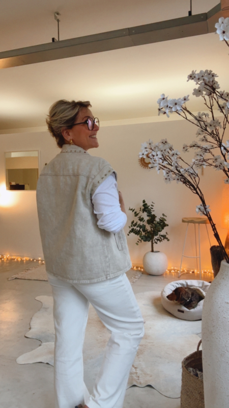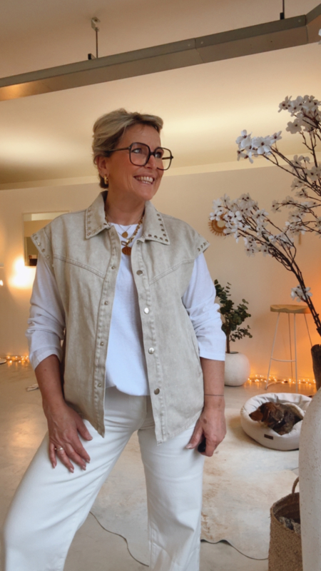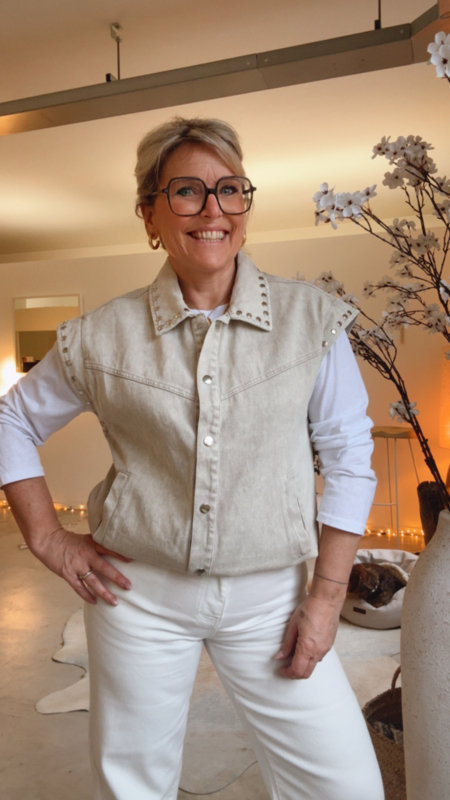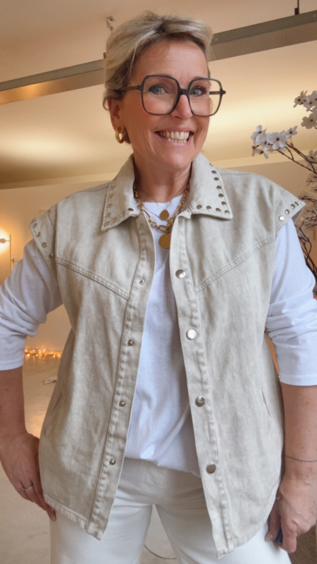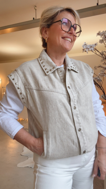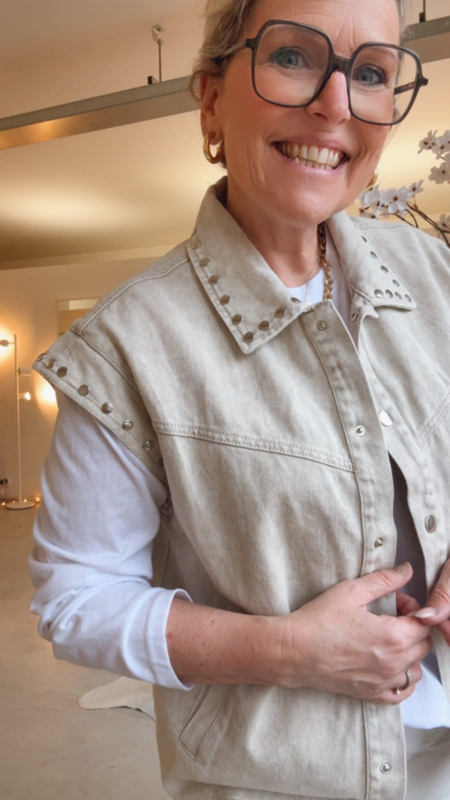 Een superleuk beige jeans hemd met mooie studs aan de kraag en aan de mouwen, wat het net dat tikkeltje extra geeft. Ideaal om zowel open als gesloten te dragen, perfect op een jeans, witte broek of over een T-shirt voor een casual maar verzorgde look.