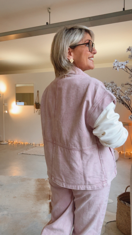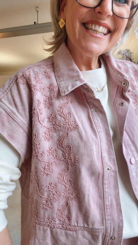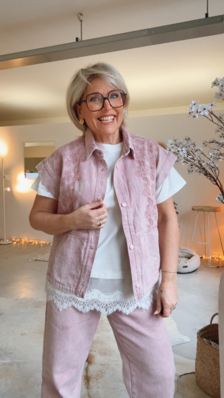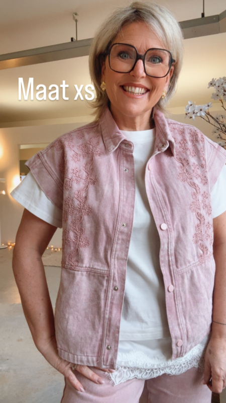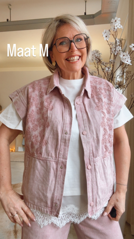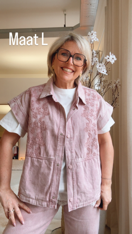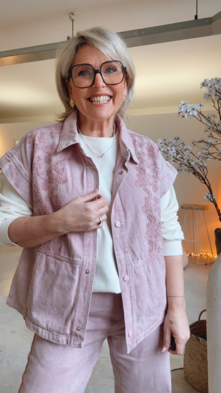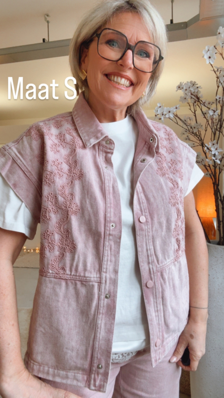 Dit prachtige jeansvest in vintage roze is echt een eyecatcher. De fijne broderie op de voorkant geeft het vest een zachte, vrouwelijke uitstraling en maakt het nét dat tikkeltje specialer. Het model draagt heel aangenaam en is ideaal om zowel open als gesloten te dragen.