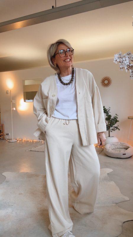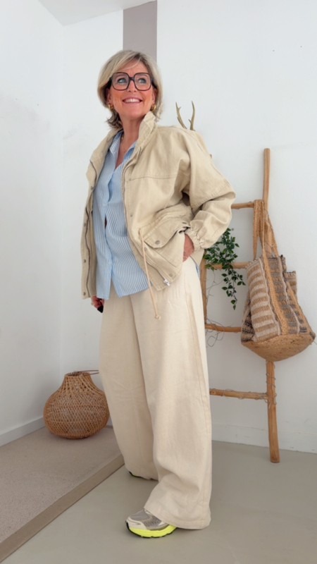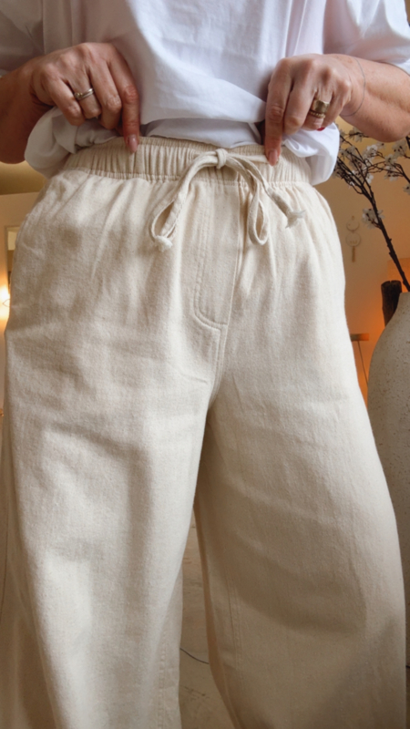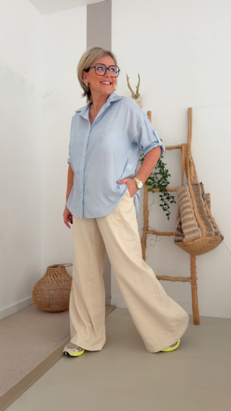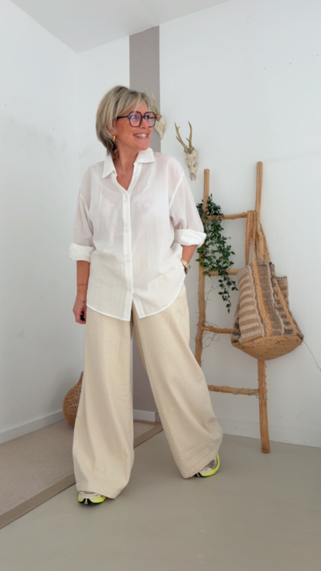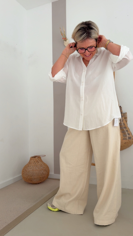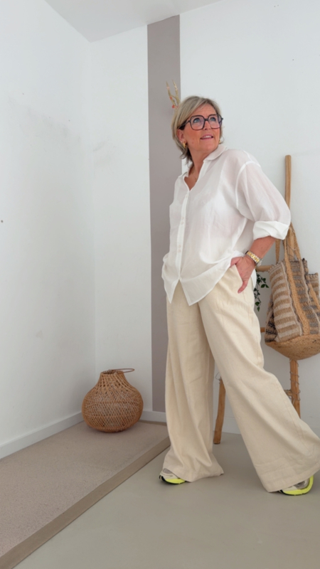 Deze prachtige linnen look broek is een echte favoriet voor wie houdt van comfort en een rustige, stijlvolle uitstraling. De broek heeft een losse, mooie pasvorm met een elastische tailleband en striklint, waardoor ze heerlijk draagt en tegelijk heel flatterend valt. Het natuurlijke materiaal geeft die zachte, nonchalante look die perfect past bij elk seizoen.