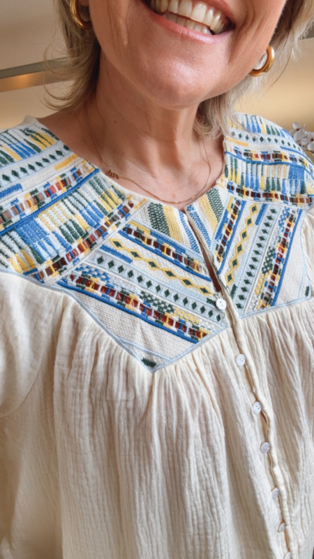 De fijne borduursels aan de hals geven het hemdje net dat beetje extra en zorgen voor een zachte, bohemian uitstraling. Perfect gecombineerd op een beige of gele broek voor een lichte look, maar minstens even mooi op een jeans voor een meer casual outfit.