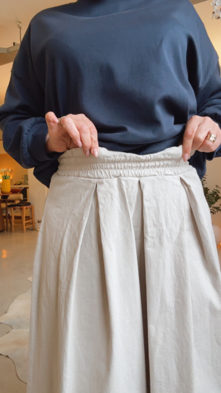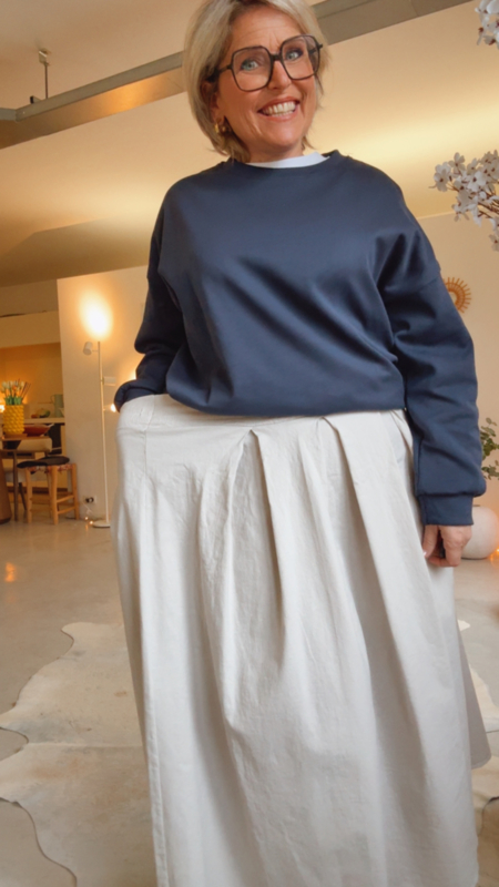 Stylingtip: heel sportief te combineren met een sweater en sneakers, maar ook prachtig met een hemd of blouse voor een meer geklede look. Een veelzijdige rok die je makkelijk het hele seizoen door draagt.