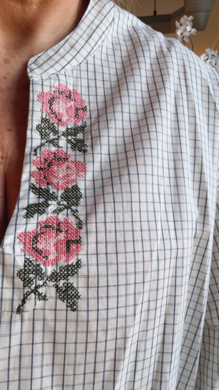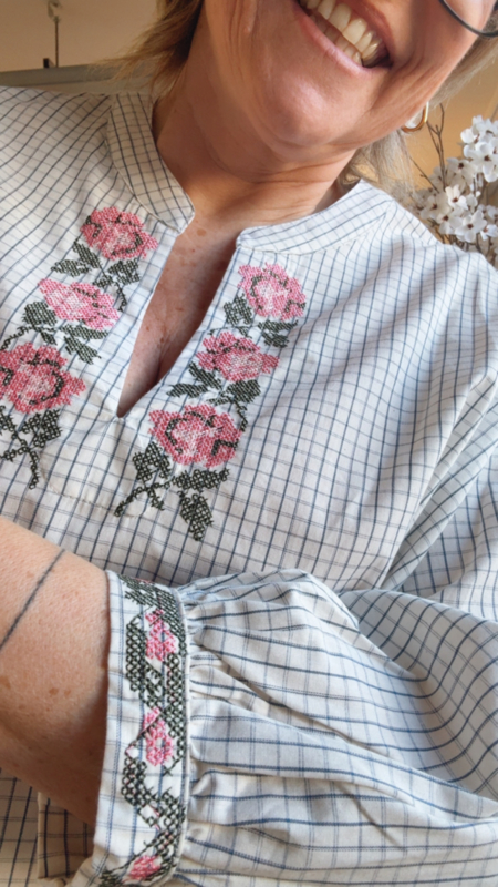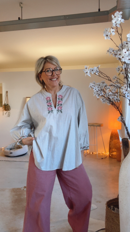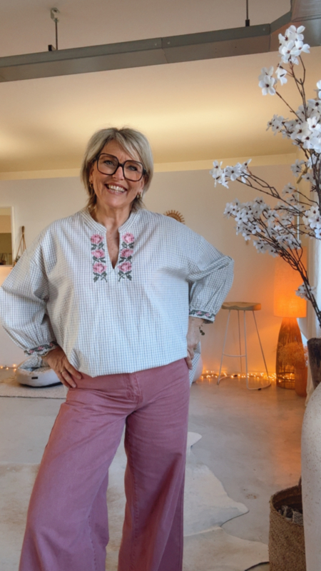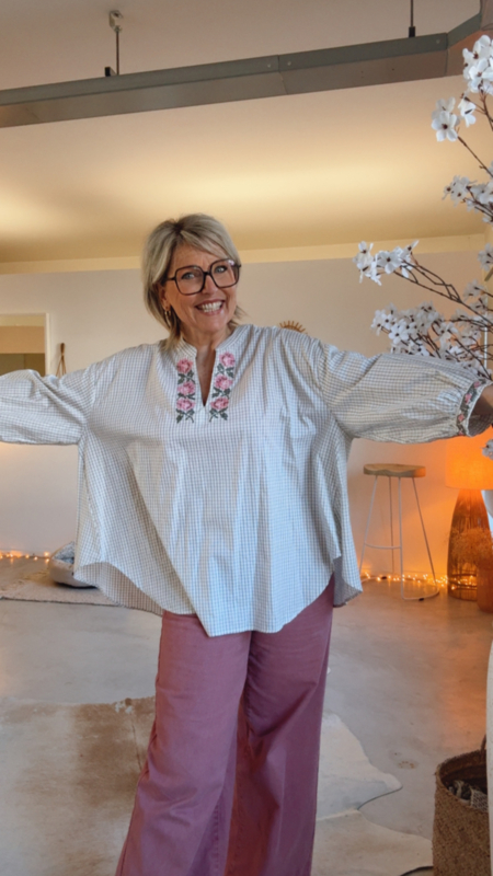 Een prachtig hemdje met fijne, vrouwelijke details dat meteen opvalt door de mooie afwerking. Aan de hals en aan de mouwen vind je subtiele geborduurde bloemetjes en kruisjes, wat zorgt voor een zachte en elegante uitstraling. Dankzij de losse pasvorm valt het hemdje heel comfortabel en luchtig, ideaal om zowel casual als iets gekleder te dragen.
