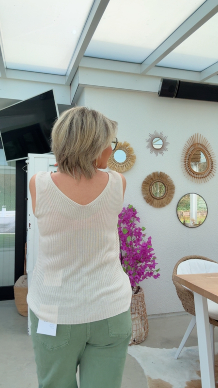 Deze fijne, ribgebreide top is een echte basis die je eindeloos kan combineren. De zachte beige tint maakt hem tijdloos en elegant, terwijl de ribstructuur en de V-hals zorgen voor een vrouwelijke en flatterende look.
