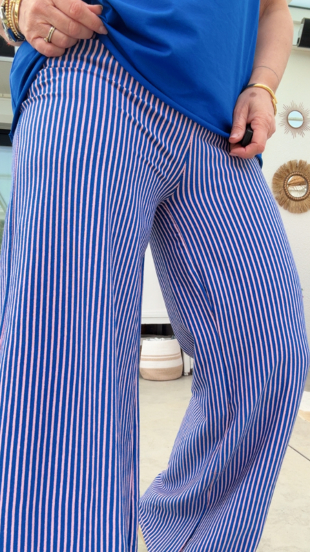 Deze kobaltblauwe broek met roze streepjes is een echte blikvanger en perfect voor wie van kleur houdt. De frisse combinatie van blauw en roze geeft meteen een zomerse en vrolijke uitstraling.
