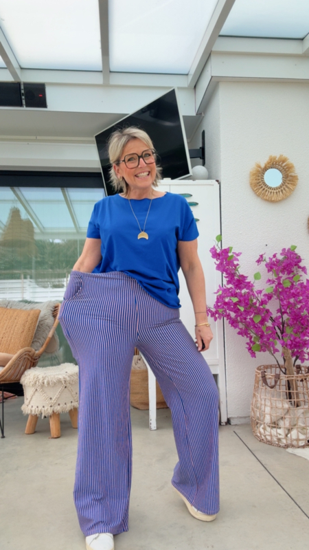 De broek combineert prachtig met de kobaltblauwe of roze Anja T-shirt, zoals op de foto, voor een fris en kleurrijk geheel.