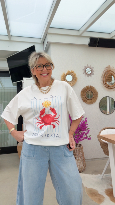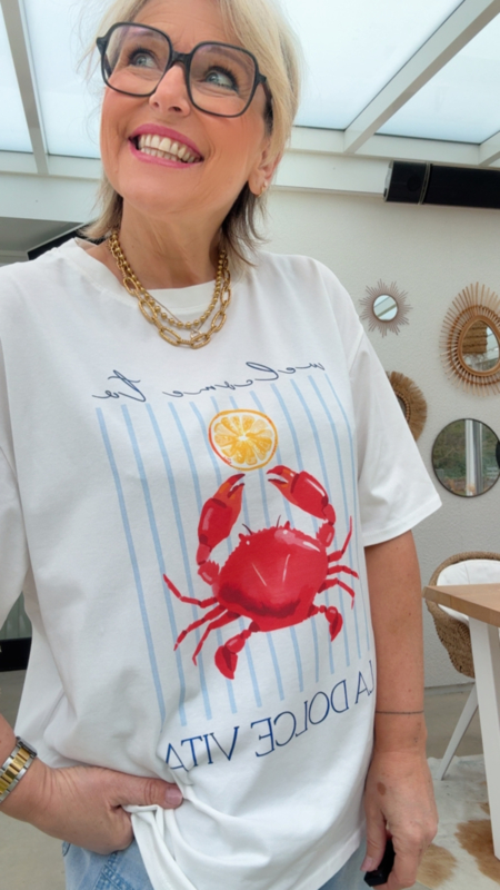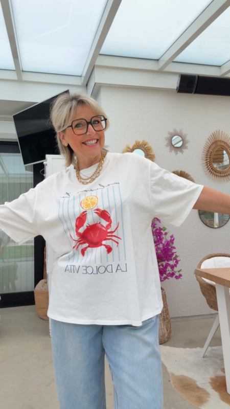 Dit luchtige T-shirt straalt meteen vakantiegevoel uit dankzij de frisse print met de rode krab en het speelse “La Dolce Vita” opschrift.