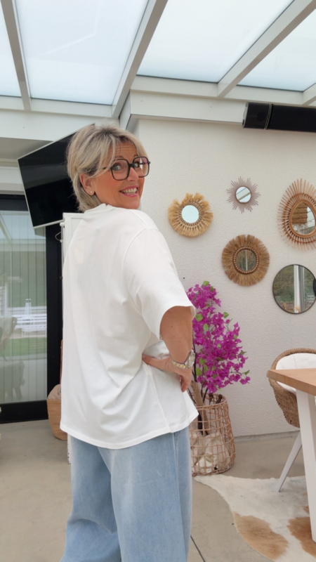 Het shirt zit heerlijk los en comfortabel en is gemaakt uit een zachte katoenmix met stretch, waardoor het mooi valt en aangenaam draagt, ook op warme dagen. Perfect om casual te combineren met een jeans, short of rok.