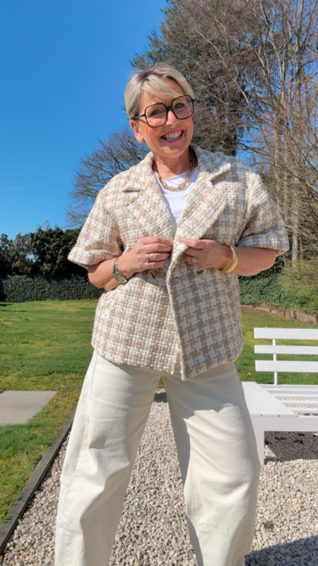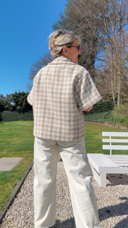 Dit blazertje heeft echt zo’n elegante Chanel-stijl waar je meteen blij van wordt. Het ecru-beige ruitje geeft het een frisse, vrouwelijke look en de korte mouwen maken het perfect voor het tussenseizoen of een frisse zomeravond. Je draagt het makkelijk open over een topje of gesloten als een stijlvol jasje.