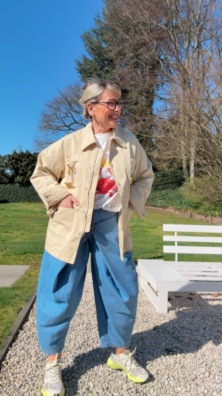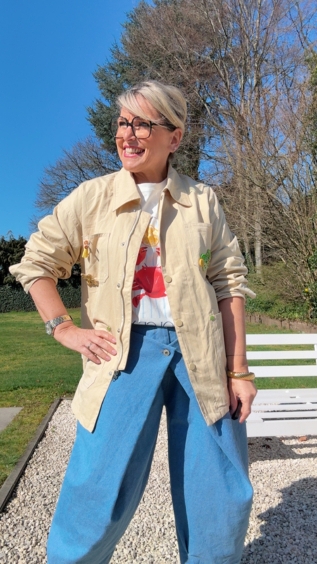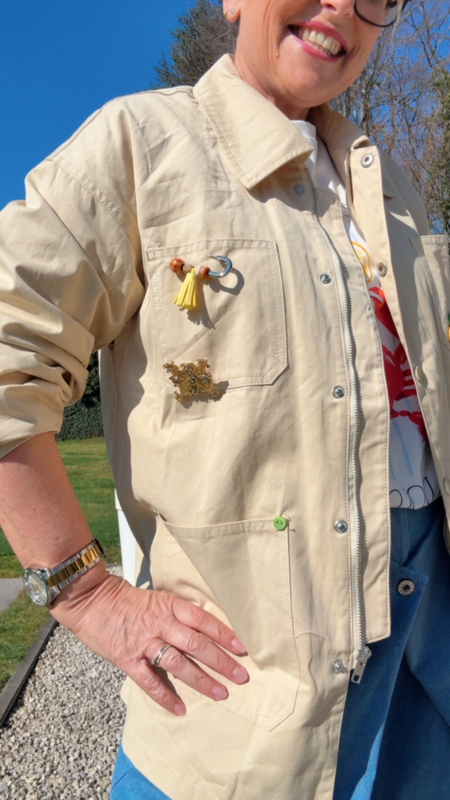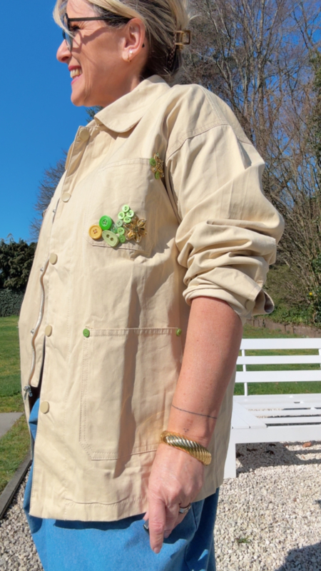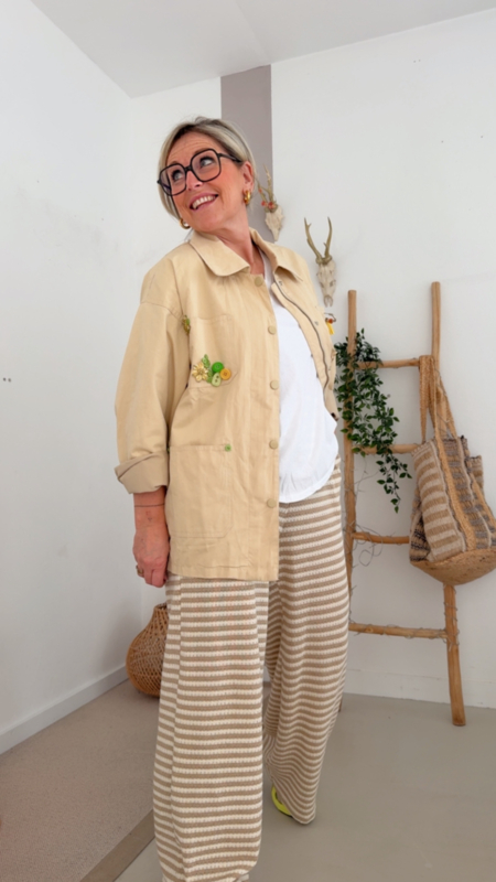 Wat dit jasje zo bijzonder maakt, zijn de mooie details zoals de speelse broches en fijne kraaltjes. Die geven het een unieke, iets meer geklede look, terwijl het toch heel makkelijk combineert, zowel casual als iets chiquer.