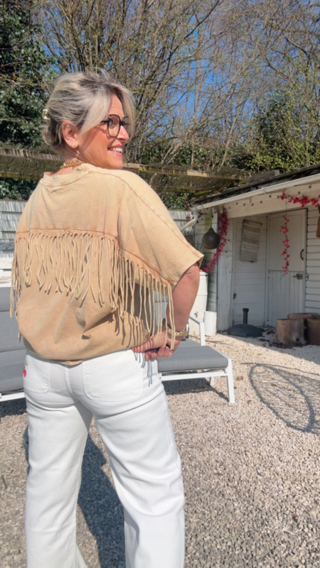 Dit superleuke T-shirt in een zachte beige tint is een echte eyecatcher door de mooie franjes op de rug. Simpel van voor, maar met dat speelse detail achteraan krijgt het net dat tikkeltje extra.