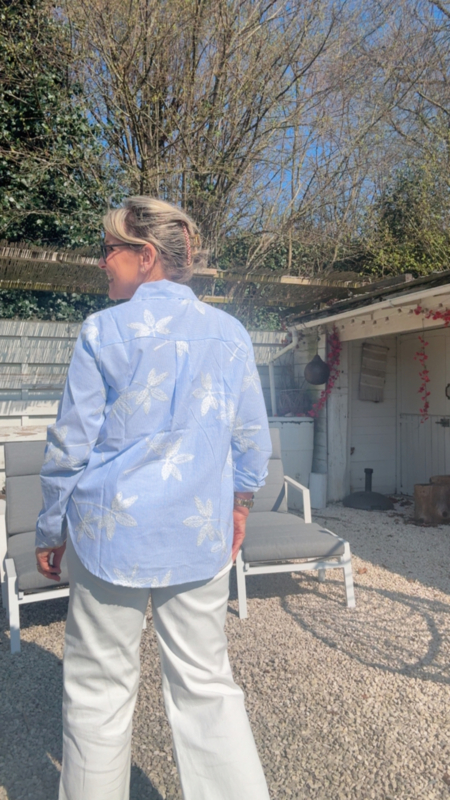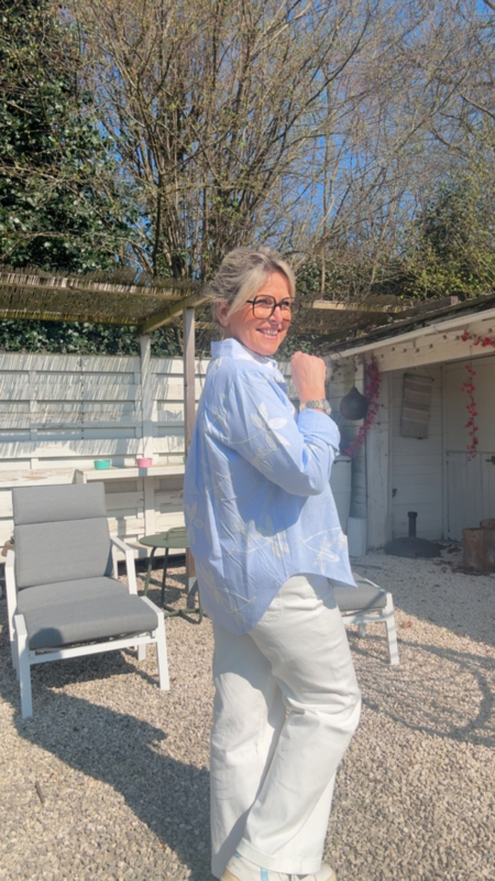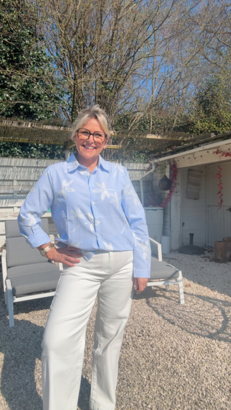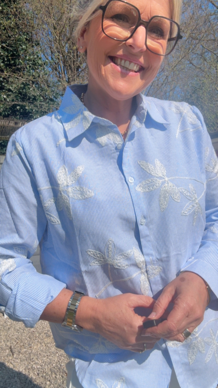 Dit frisse wit-blauw gestreepte hemdje is echt zo’n stuk waar je meteen een goed gevoel van krijgt ☀️ De fijne strepen gecombineerd met de subtiel geborduurde blaadjes geven het net dat beetje extra, zonder dat het te druk wordt. Mooi casual, maar toch verzorgd.