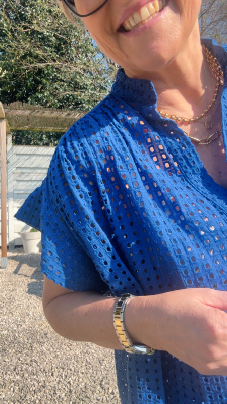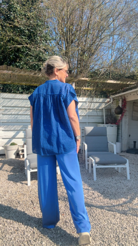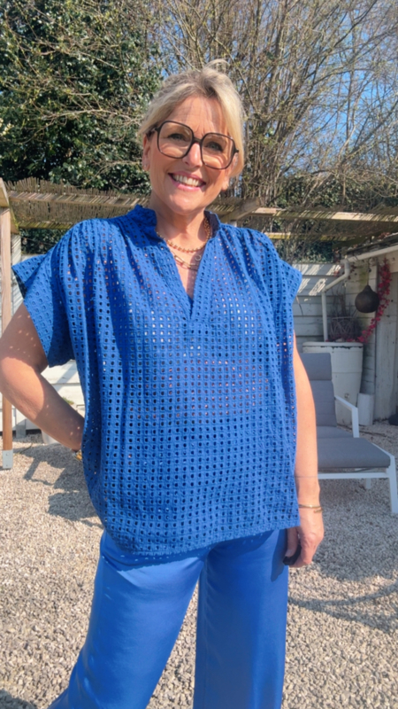 Dit prachtige kobaltblauwe bloesje is echt zo’n stuk dat meteen opvalt. De mooie structuur met fijne gaatjes geeft een speelse, elegante look en zorgt tegelijk voor een heerlijk luchtig gevoel. Ideaal voor zonnige dagen!