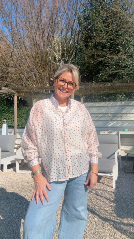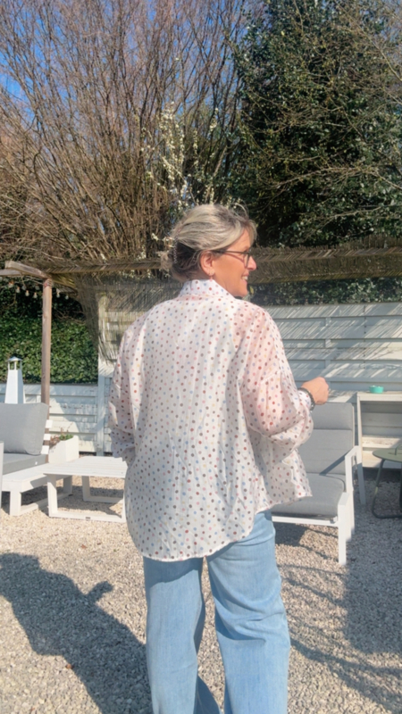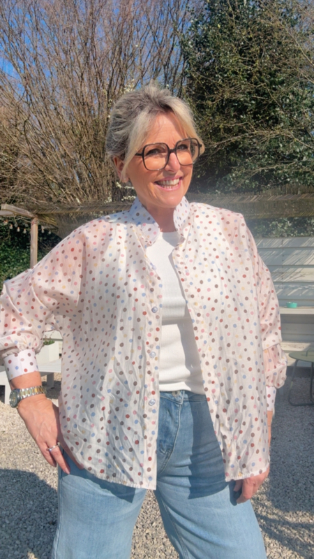 Dit luchtige bloesje met gekleurde bolletjes is zo’n stuk waar je meteen blij van wordt. De semi transparante stof geeft het geheel een zachte, vrouwelijke uitstraling zonder dat het te bloot wordt, zeker niet met een mooi topje eronder.