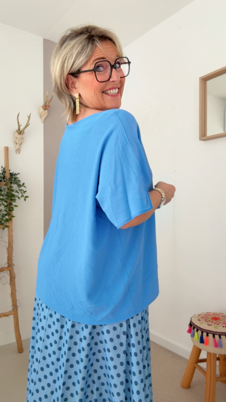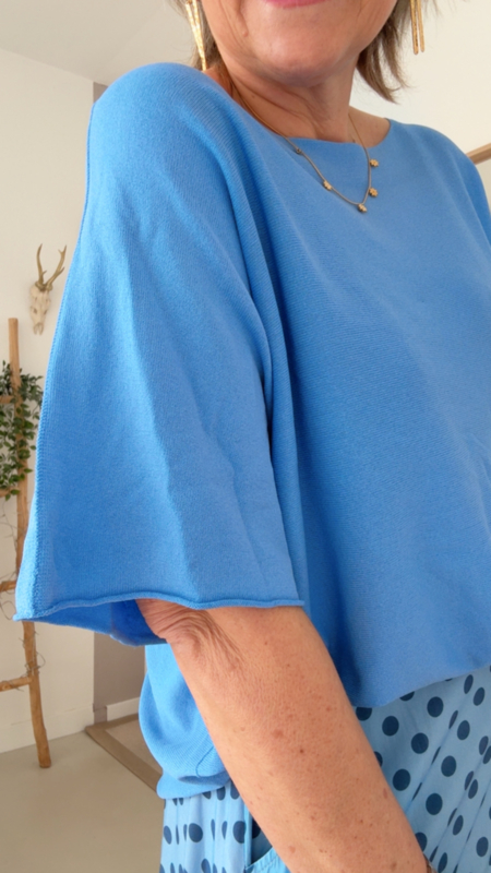 Deze supermooie lichtblauwe zomertrui is echt zo’n stuk dat je meteen goed doet voelen. De stof is heerlijk dun en luchtig, waardoor hij perfect is voor warmere dagen of frisse avonden. Dankzij het losvallende model en de zachte valling zit hij comfortabel én flatterend, zonder te strak te zijn.