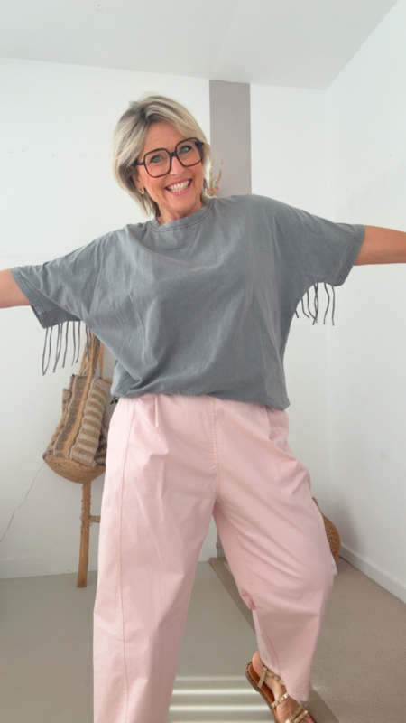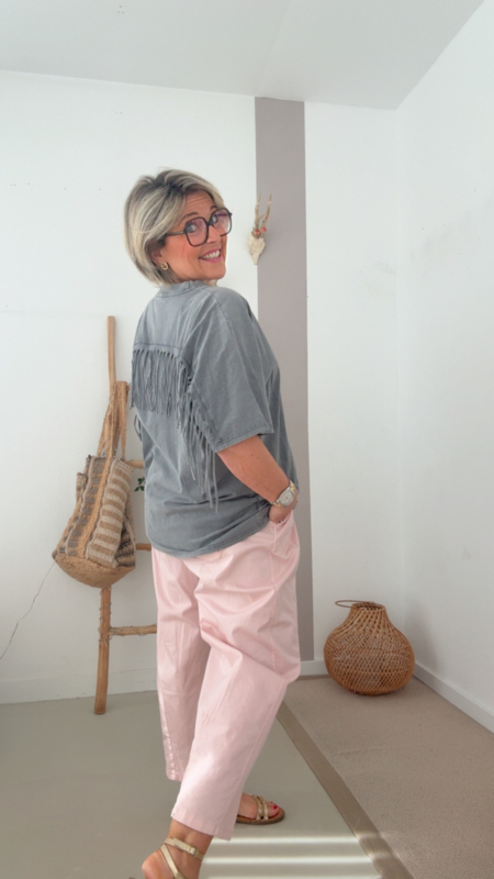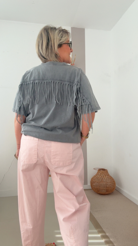 Dit superleuke T-shirt in een vintage grijze tint is een echte eyecatcher door de mooie franjes op de rug. Simpel van voor, maar met dat speelse detail achteraan krijgt het net dat tikkeltje extra.