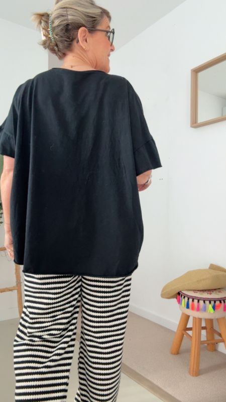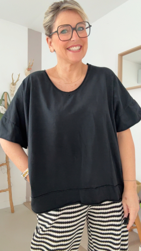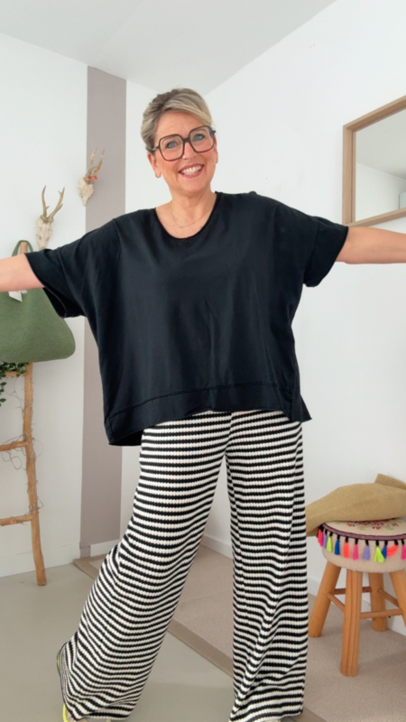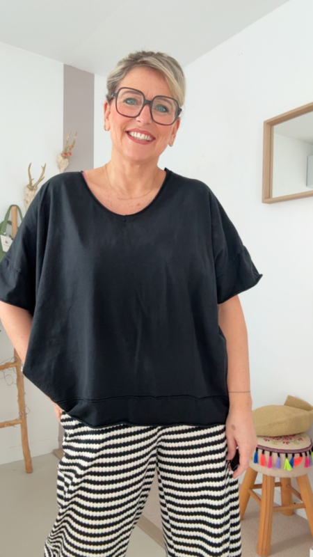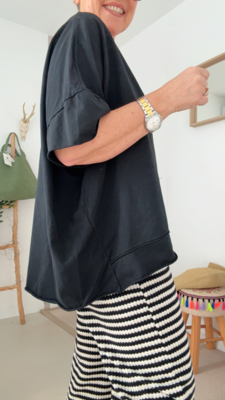 Deze heerlijke oversized zwarte T-shirt is zo’n stuk dat je gewoon altijd uit de kast neemt. De losse fit zorgt voor een supercomfortabel gevoel, terwijl de V-hals het geheel net dat tikkeltje vrouwelijk en flatterend maakt.