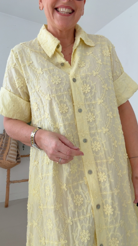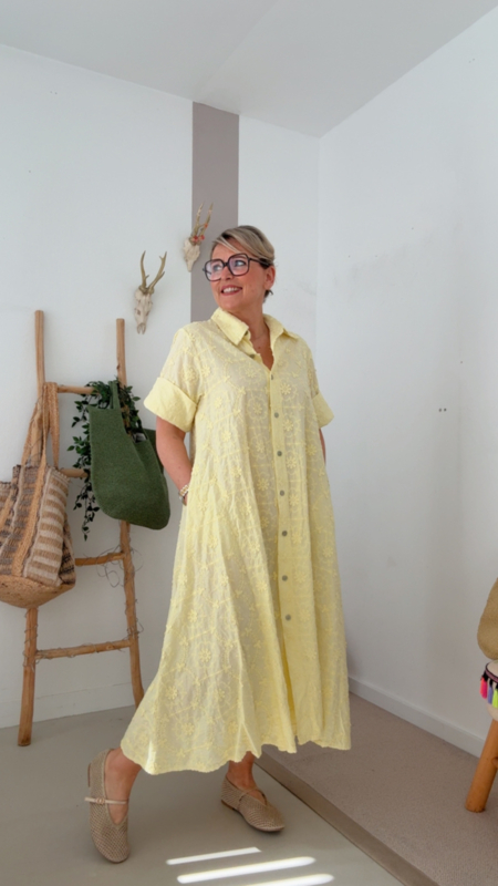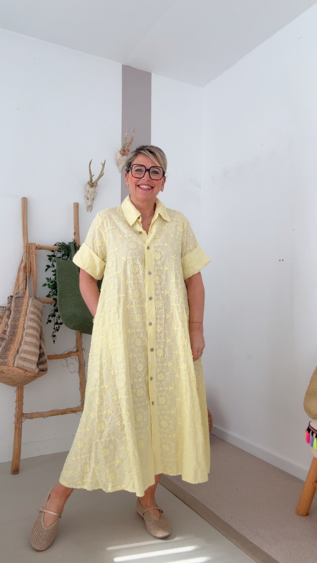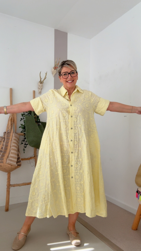 Dit prachtige kleed in lichtgeel is echt een eyecatcher. De kleur straalt en geeft je meteen een frisse, zomerse look, terwijl de fijne geborduurde details het net dat beetje extra geven.