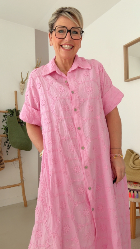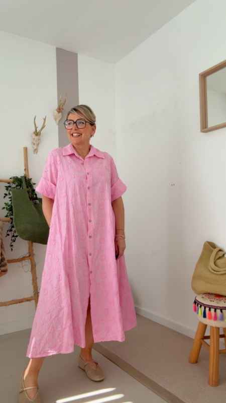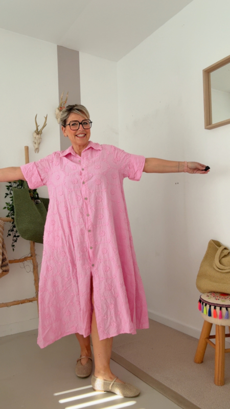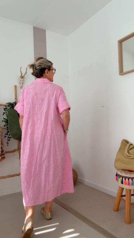 Dit prachtige kleed in roze is echt een eyecatcher. De kleur straalt en geeft je meteen een frisse, zomerse look, terwijl de fijne geborduurde details het net dat beetje extra geven.