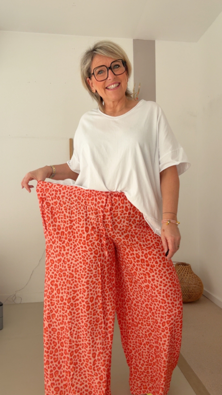 De pasvorm is los en soepel met brede pijpen, waardoor hij heerlijk zit en mooi valt rond het lichaam. Dankzij de elastische tailleband trek je hem gewoon aan en zit hij meteen goed, geen gedoe. Ideaal voor elke dag, maar evengoed leuk om iets gekleder te dragen.