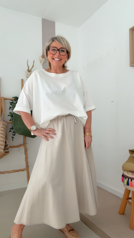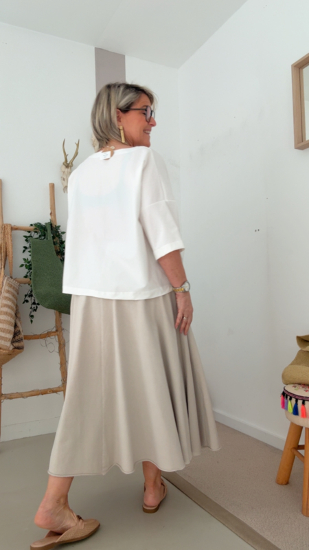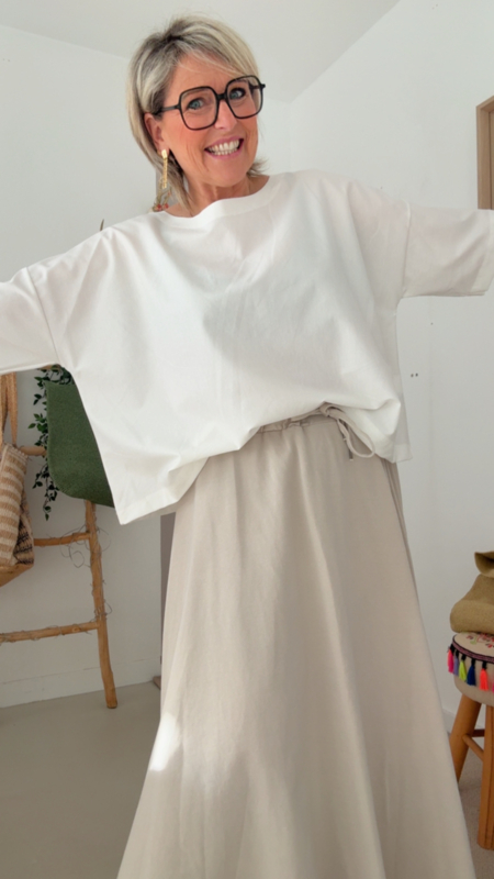 Leuk wit T-shirtje in een iets korter model, maar mooi oversized vallend. Ideaal om los te dragen op een broek of rok met hoge taille.