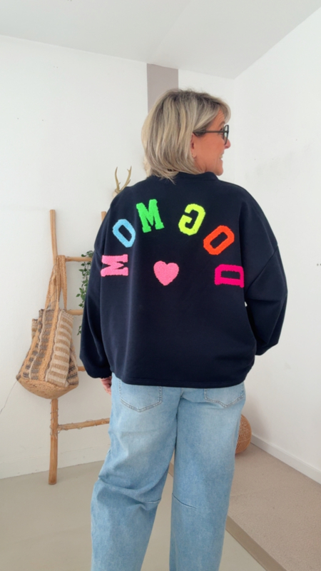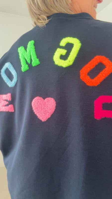 De achterkant is echt een eyecatcher met “DOGMOM” in fluor teddy letters en een hartje erbij – vrolijk, zacht en net dat tikkeltje anders.