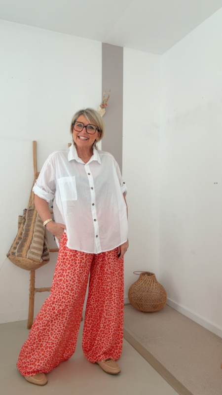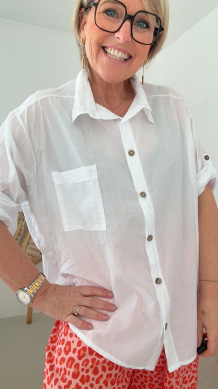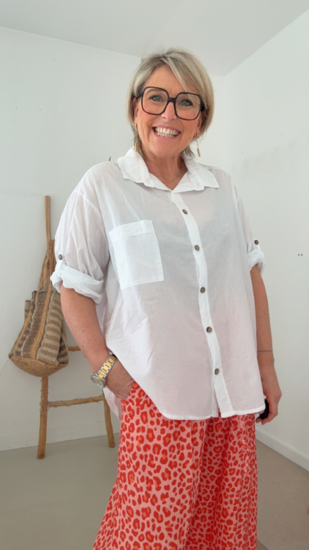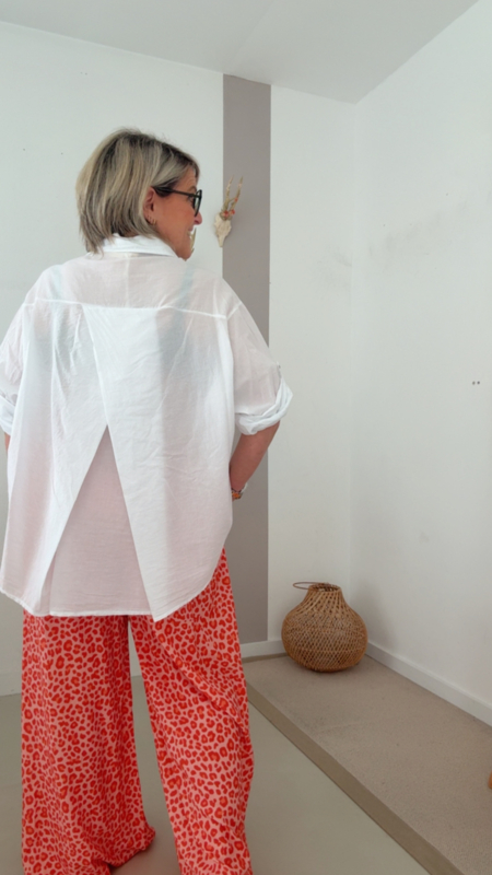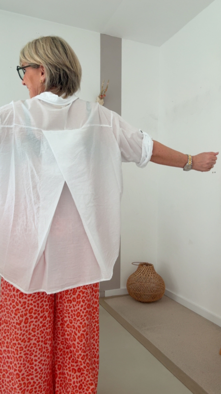 Dit wit hemdje is zo’n item dat je overal bij kan dragen, maar door het open detail op de rug toch iets speciaals heeft. Heel mooi losvallend en ideaal voor de warmere dagen.