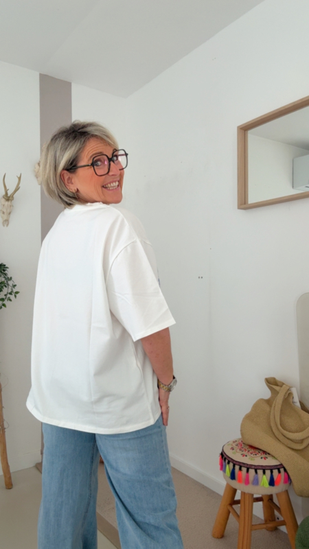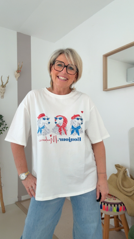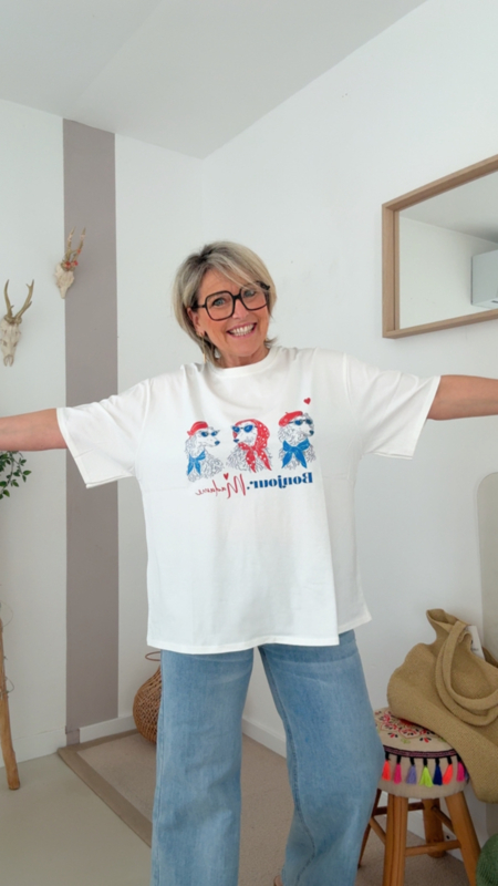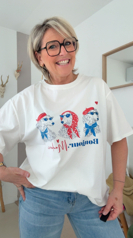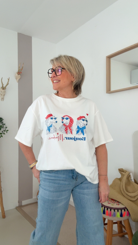 Dit T-shirt met drie Parijse hondjes en “bonjour madame” print is echt zo’n leuk item dat meteen opvalt. Makkelijk te combineren op een jeans of een kleurrijke broek, en zit ook nog eens supercomfortabel.