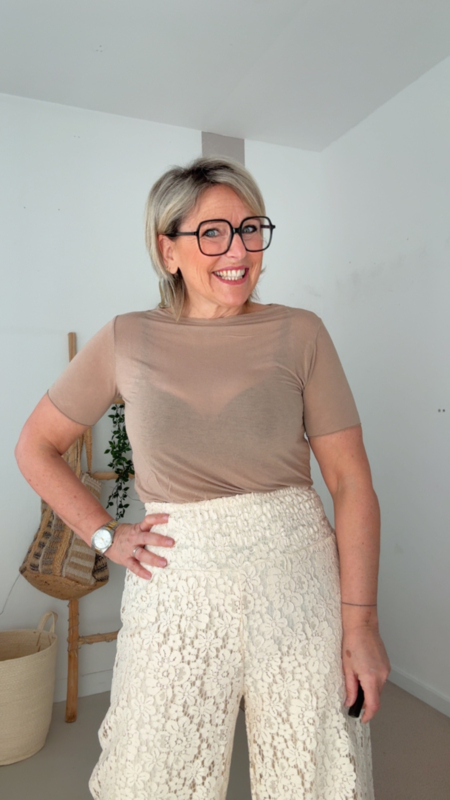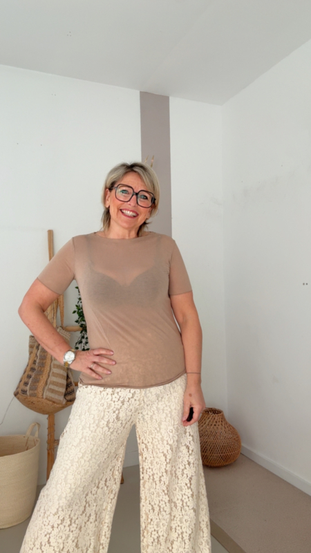 Dit semitransparante T-shirt is echt zo’n basisstuk dat je overal onder kan dragen. Licht, zacht en super aangenaam op de huid, met een mooie fijne uitstraling.