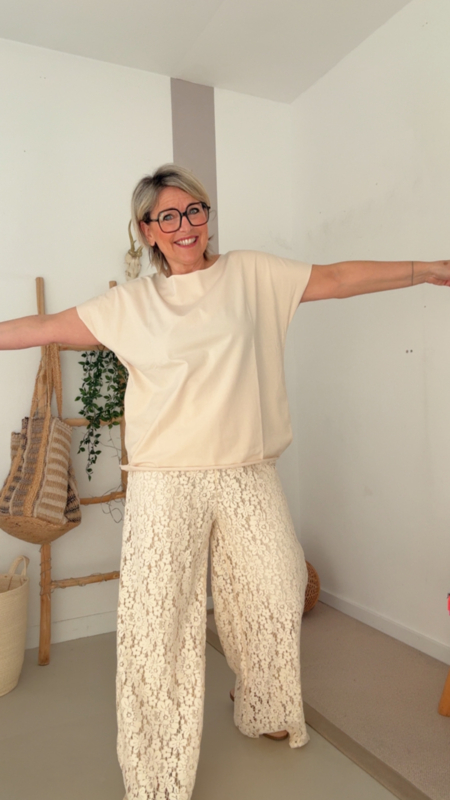De T-shirt heeft een losse, flatterende fit en valt mooi soepel rond het lichaam. De randen zijn bewust ruw en onafgewerkt afgeknipt, wat zorgt voor die typische relaxte look waar de Anja zo geliefd om is. Perfect om casual te dragen, maar even mooi gecombineerd onder een blazer of vest.