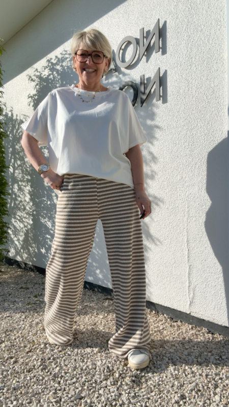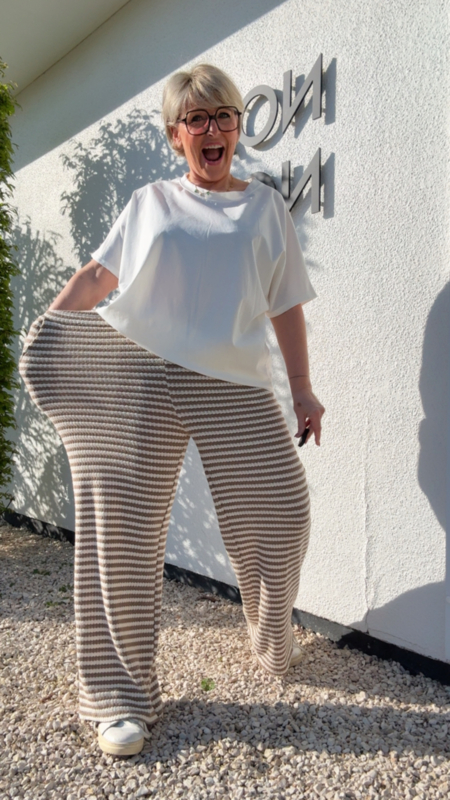 Deze heerlijke broek is zo’n stuk dat comfort en stijl perfect samenbrengt. De zachte gebreide stof voelt super aangenaam aan en dankzij de beige en ecru streepjes krijgt de broek een frisse, zomerse uitstraling. De pasvorm is losvallend en heel flatterend, met een elastische tailleband waardoor ze prachtig meegeeft.