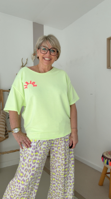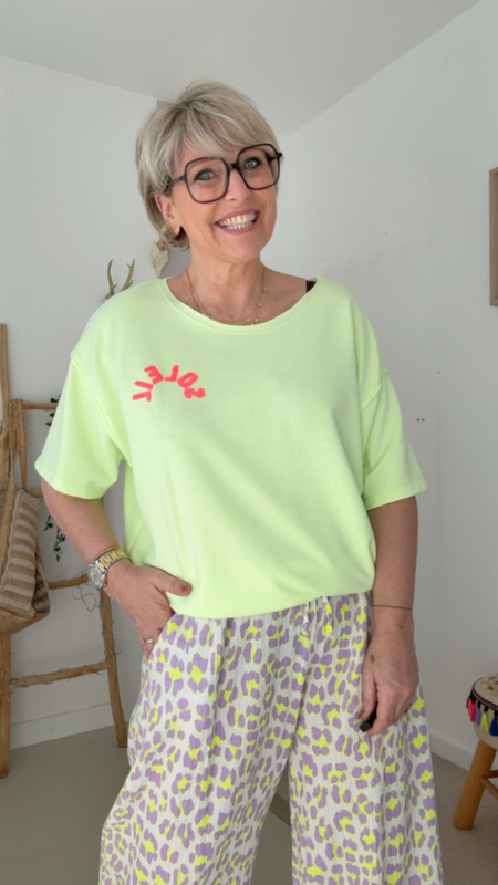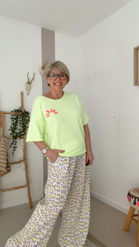 De stof voelt zacht en comfortabel aan en valt mooi losjes, ideaal voor een casual maar toch trendy look. Perfect om te combineren met een jeans, short of zoals hier met een leuke printbroek.