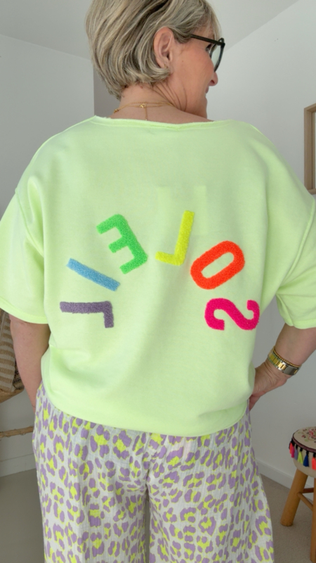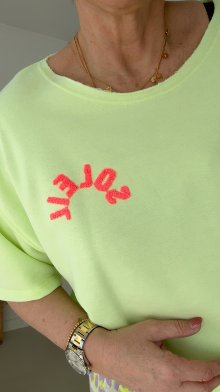 Superleuke fluor gele trui met speelse teddy letters “Soleil" 💛