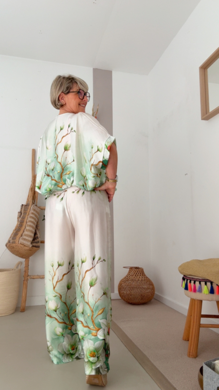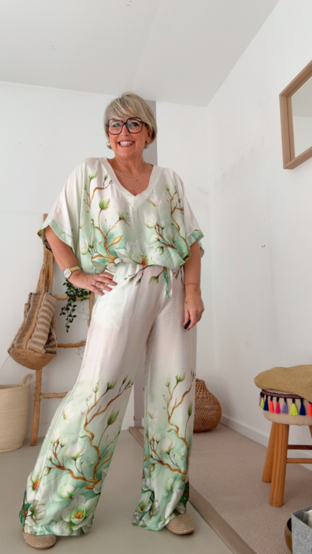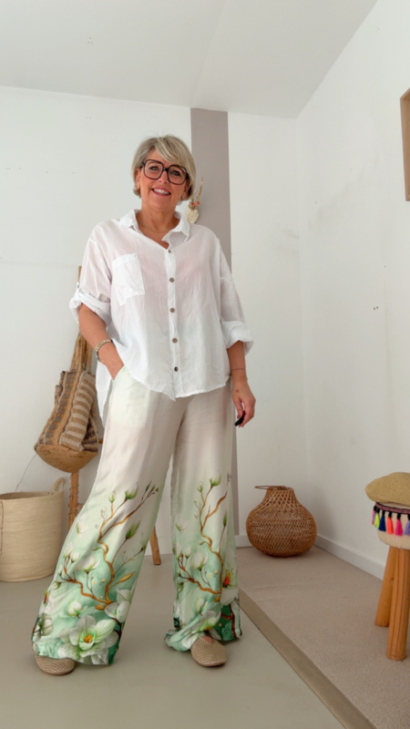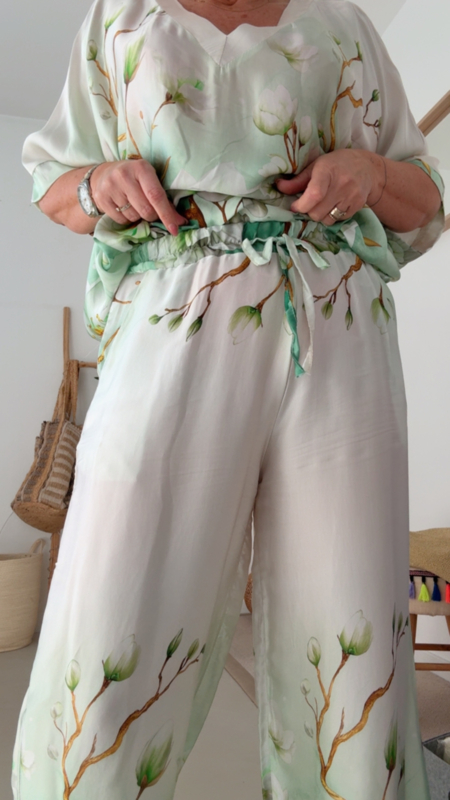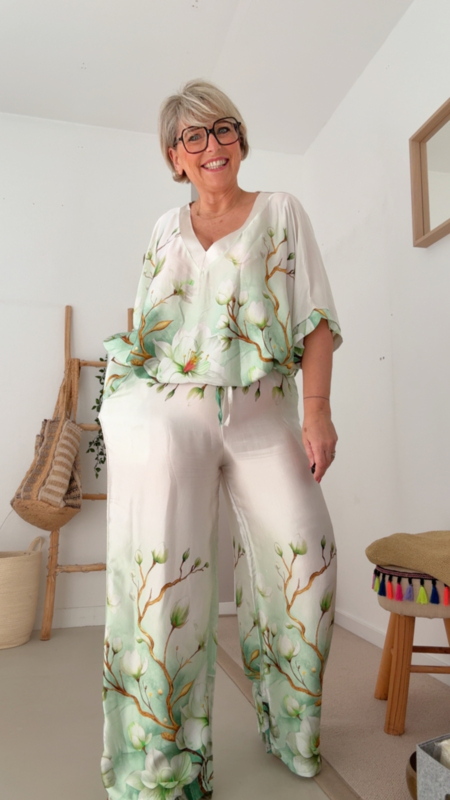 De print in zachte groentinten met fijne bloemen zorgt voor een rustige, frisse vibe en maakt deze broek echt een eyecatcher zonder te druk te zijn. Perfect voor wie houdt van iets speciaals, maar toch stijlvol en draagbaar.