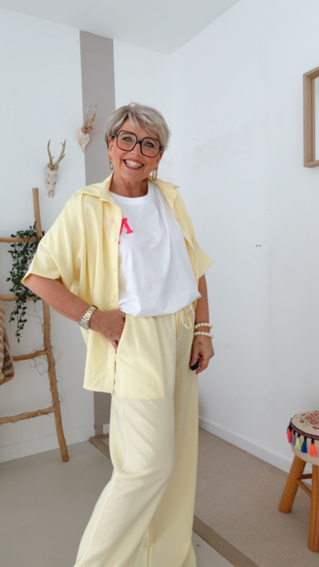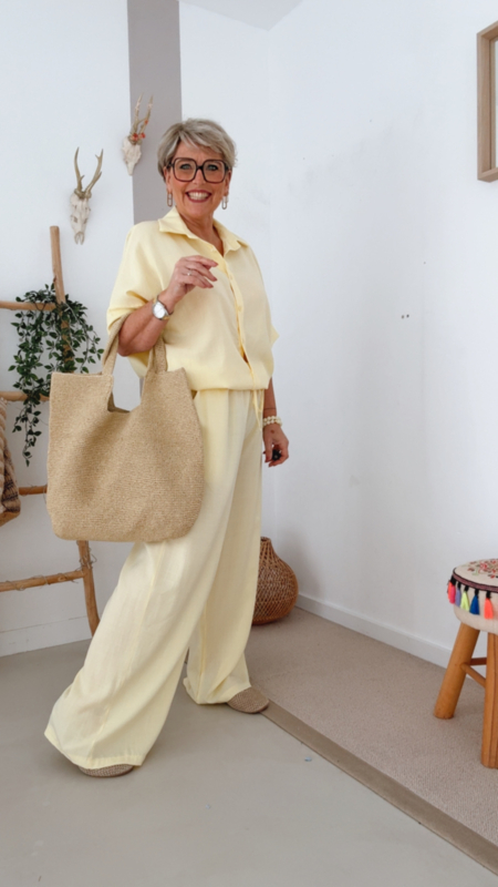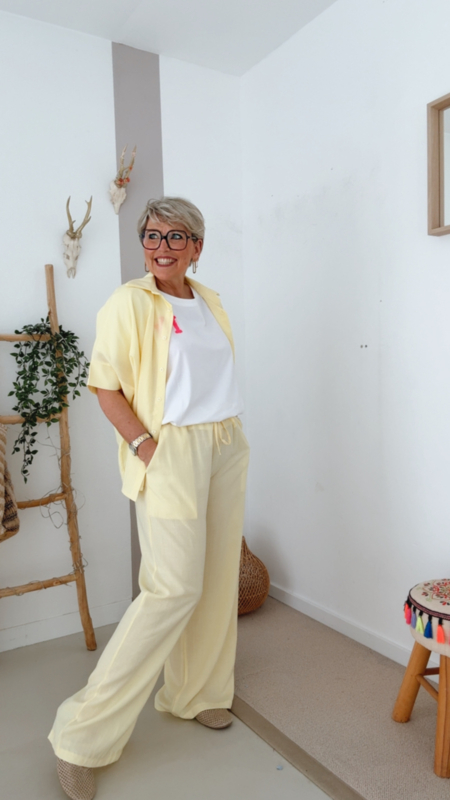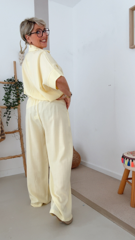 Een supermooie gele broek in een zachte, soepel vallende stof. Ze zit heerlijk los en luchtig en heeft een mooie wijde pijp, waardoor ze altijd flatterend valt.