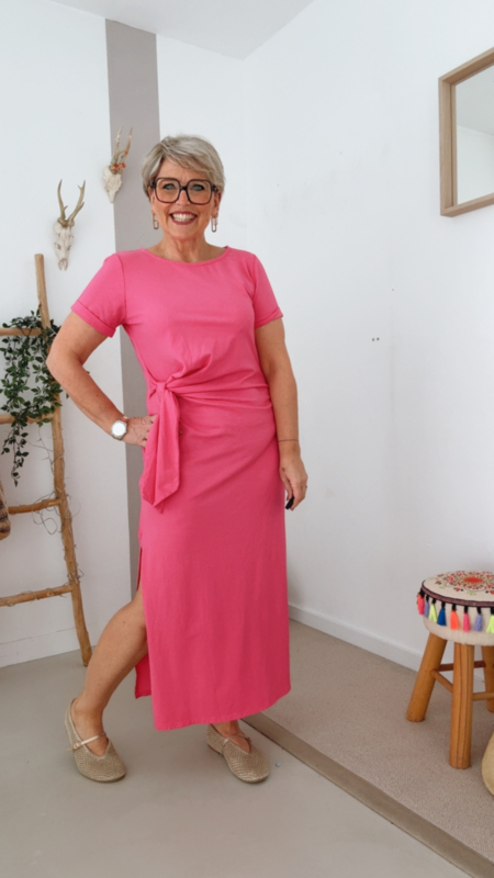 Dit roze T-shirt kleed is zo eentje dat je gewoon altijd uit de kast kan nemen. Simpel, maar met net dat beetje extra door de knoopdetail aan de zijkant, waardoor het mooi in de taille valt en je figuur subtiel volgt.