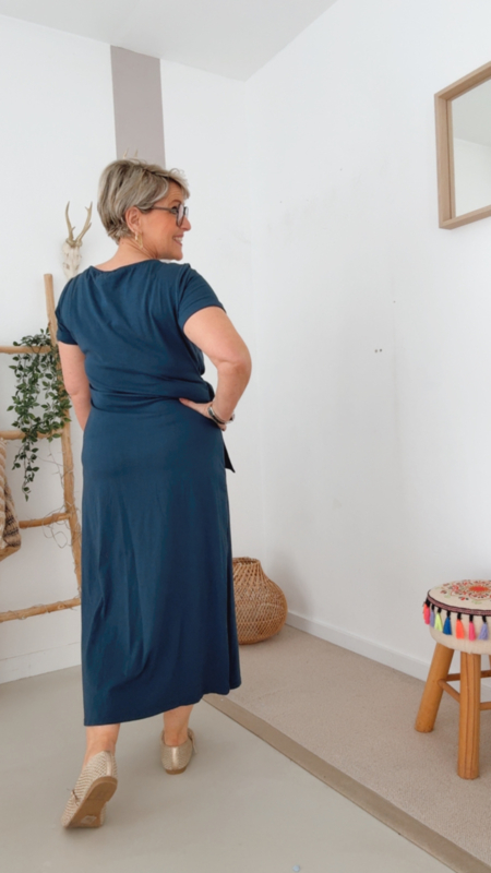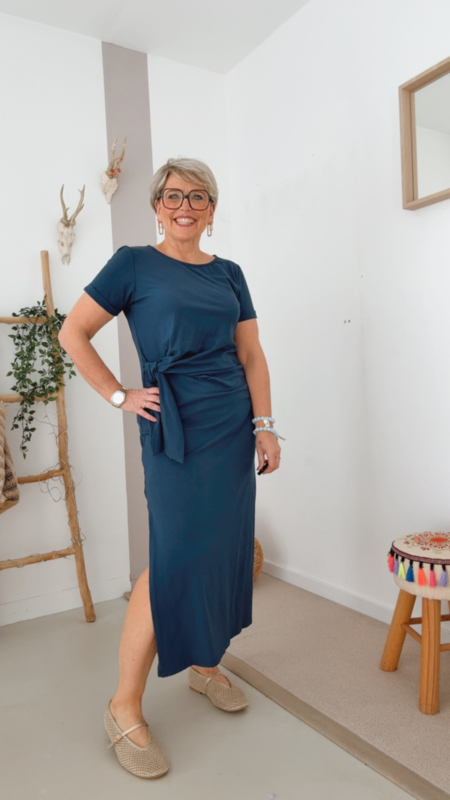 Dit blauwe T-shirt kleed is zo eentje dat je gewoon altijd uit de kast kan nemen. Simpel, maar met net dat beetje extra door de knoopdetail aan de zijkant, waardoor het mooi in de taille valt en je figuur subtiel volgt.