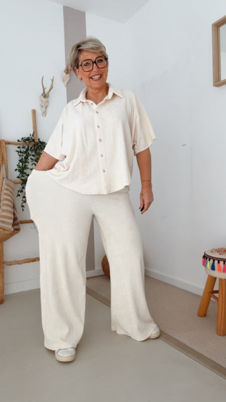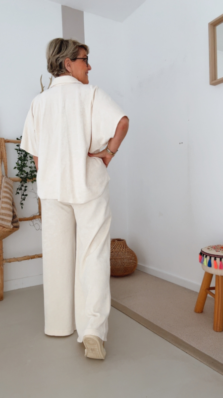 Deze zalige badstof broek is puur comfort met een stijlvolle twist. De zachte katoen voelt heerlijk aan en maakt dit de perfecte broek voor ontspannen dagen, een tripje naar zee of gewoon een casual look met nét dat tikkeltje extra.