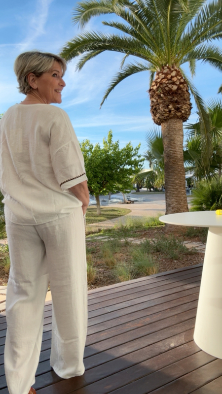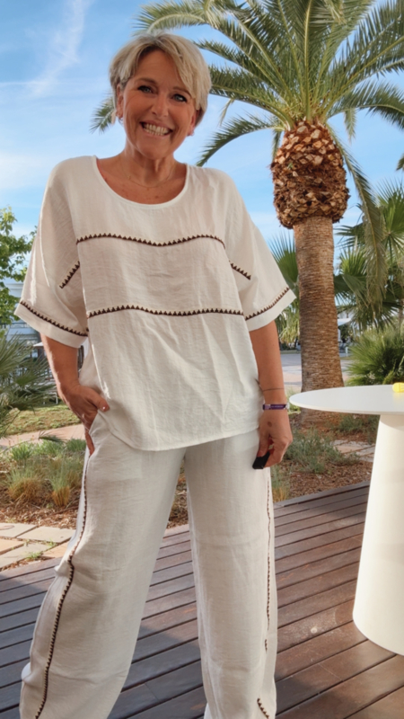 De top valt los en luchtig en combineert prachtig met de bijpassende broek. De fijne details en het zachte materiaal geven het geheel een elegante, maar toch casual uitstraling.