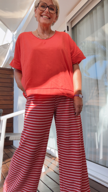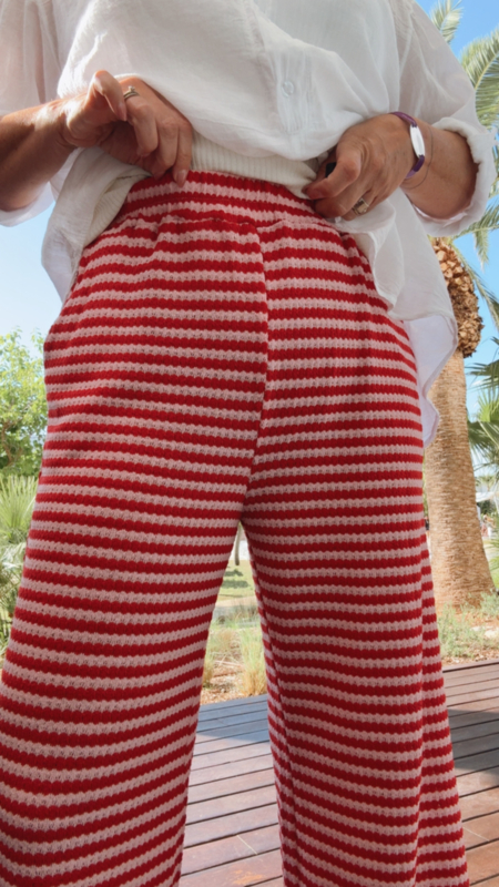 Superleuke gebreide zomerbroek in roze en rode streepjes