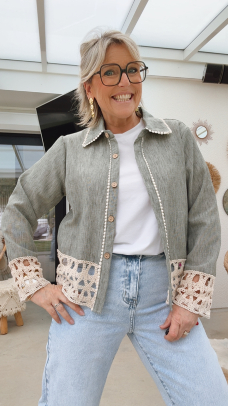 Een leuk en vrouwelijk jasje met een zachte, natuurlijke uitstraling. De mooie groene tint geeft het geheel een frisse en stijlvolle look, terwijl de fijne details het jasje net dat tikkeltje extra geven. Onderaan en aan de mouwen…