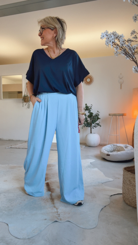Deze donkerblauwe jeans is zo eentje dat je meteen wil blijven dragen. Super comfortabel dankzij de elastische tailleband met koordje, maar toch mooi vrouwelijk en gekleed…