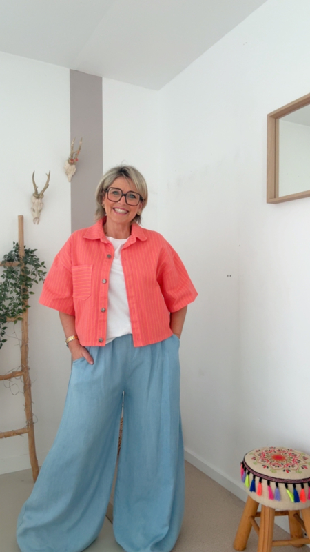 FaraDit leuke vestje/hemdje in jeansstof is zo’n item dat je er snel bij neemt. De oranje-roze kleur met fijne geel-oranje streepjes geeft meteen een warme, vrolijke uitstraling. Je kan het zowel gesloten dragen als een hemdje, of…