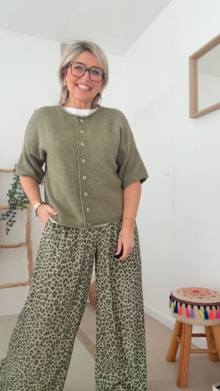 Tara kakiDit fijne cardigannetje heeft een supermooie, zachte look en valt losjes waardoor het altijd goed zit. Je draagt het open of dicht, op een rok, broek of kleedje, echt zo’n veelzijdig item dat overal bij past.